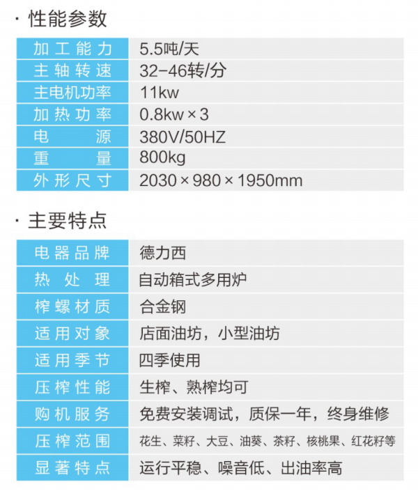★壓榨范圍:花生、大豆、菜籽、油葵、茶籽、芝麻等;★適用對象:店面油坊和微小油坊;★壓榨性能:熱榨一次榨盡,免費安裝調試